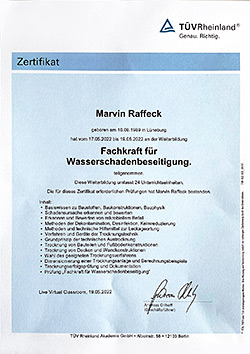 Wir legen großen Wert auf Weiterbildung. Durch die aktuellste Schulung die wir durchlaufen haben, ist Marvin Raffeck nun TÜV Rheinland zertifizierte „Fachkraft für Wasserschadenbeseitigung“.